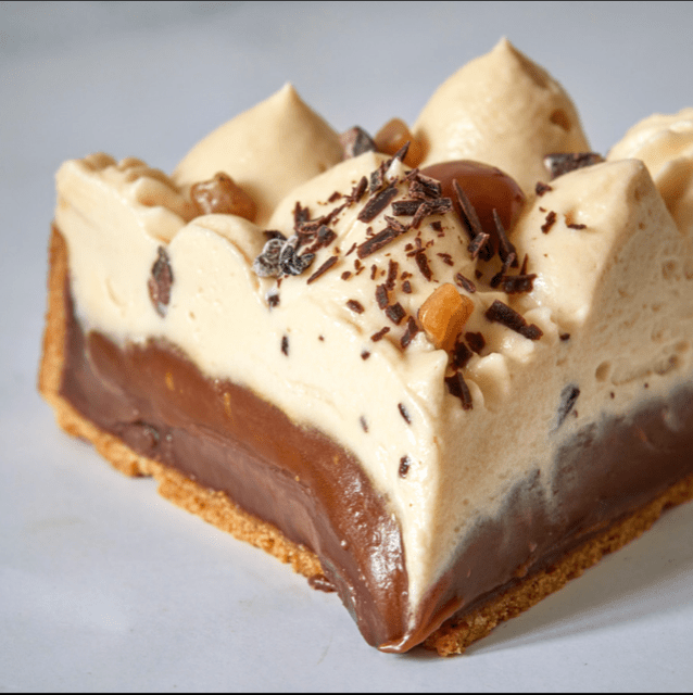 1. Pocher le caramel en forme d’escargot sur la tarte, et la mettre 10 minutes au congélateur.
