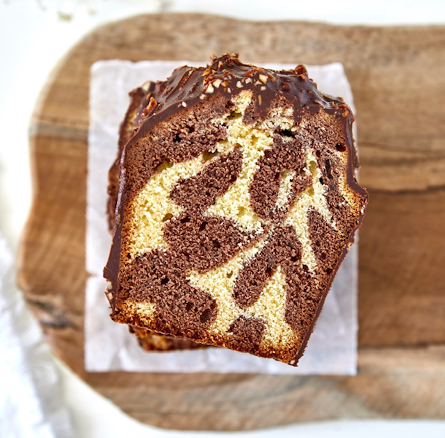 Chez nous, c’est un goûter qu’on adore faire et manger : le cake marbré vanille et cacao. En plus il est très facile et rapide à faire. Le glaçage est vraiment optionnel, surtout en été, il fond très vite :p